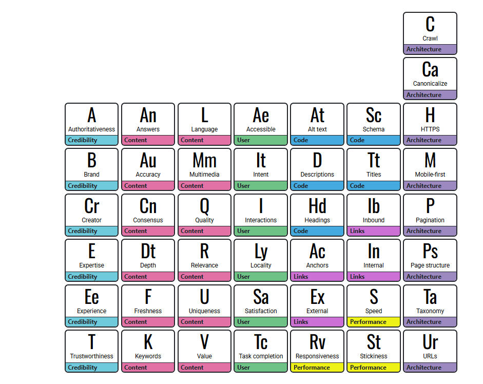 The SEO Periodic Table is divided into groups of related elements. Each element represents a factor that plays an important role in achieving SEO success.